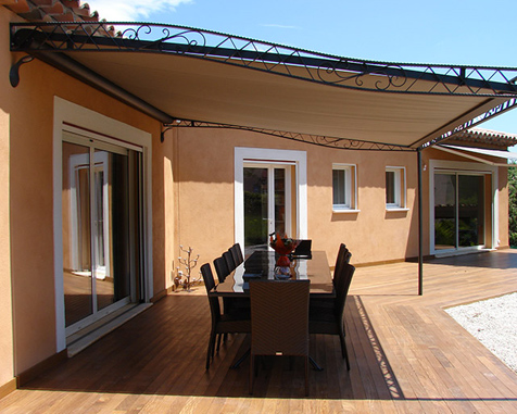 • C’est une pergola traditionnelle en fer forgé sur laquelle repose un store Alizé.